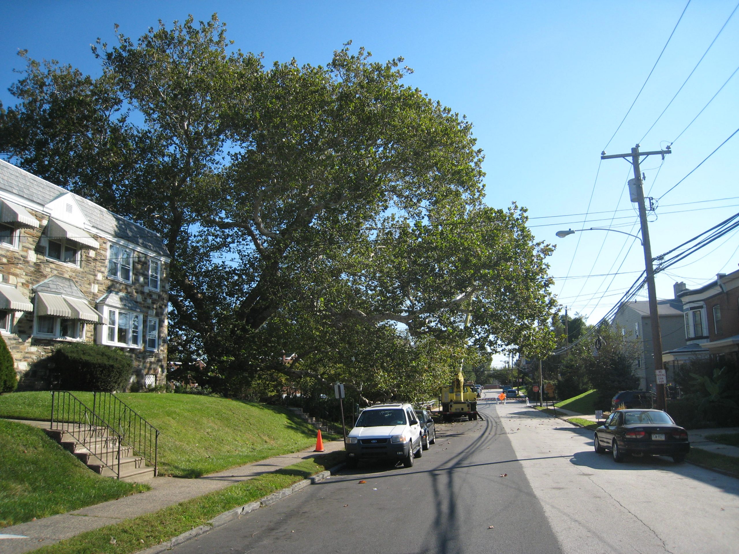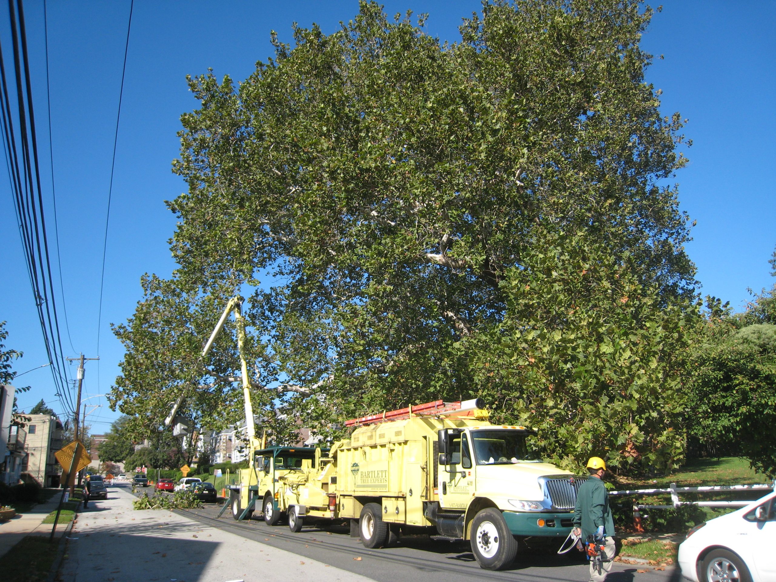In the 1980’s, two supporting props were installed on a 80′ long, 24″ diameter low limb, but during a recent storm the massive limb collapsed onto the sidewalk. John Studdy, Arborist Representative from Bartlett’s Bala Cynwyd office, and his crew: Rubio Rosales, Michael Sanchez, Damean Snyder, Chip Brumbaugh, and Daniel Dyer, proudly stepped in to improve the health of the beautiful tree.