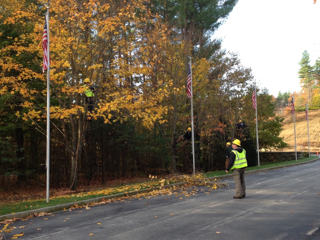 On October 19, 2013, Hooksett employees Joe Davis (Arborist Rep.), Rich Herfurth (Div. 1 Safety & Training Coordinator) and crew members Dan Stouch, Daron Moser, and Morgan Roy donated their time, skills, and equipment at the annual New Hampshire Arborists Association Fall Workday. This year the event took place at the NH State Veterans Cemetery in Boscawen, NH. They spent the day performing structural pruning/weight reduction and clearance so that all the American flags are much more visible. They also performed root collar excavations to several trees and educated cemetery staff on the benefits of this procedure.